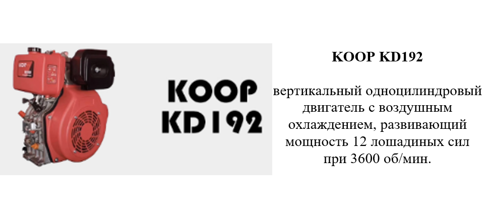 ДВС Koop 192F — Одно цилиндровый двигатель с жидкостным охлаждением, развивающий мощность 13 лошадиных сил при 3600 об/мин.