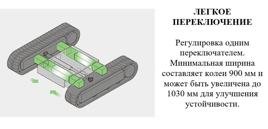 Регулируемая ширина колеи и отвала — Минимальная ширина составляет колеи 900 мм и может быть увеличена до 1030 мм для улучшения устойчивости
